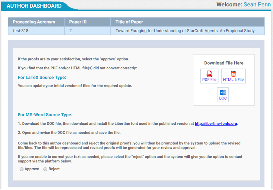 After the successful processing of your manuscript file you will receive the PDF output via email and the TAPS author dashboard will show the following output files on your author dashboard: PDF, HTML5, DOC, and LOG.